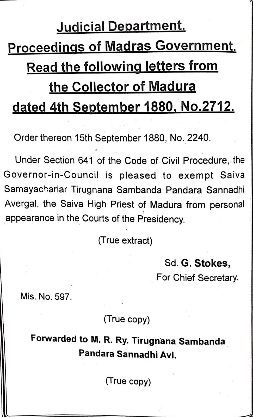 On 4 Sep 1880, the Governor in Council G. Stokes, passed an order exempting the Pontiff of Madurai from personal judicial court appearances, as a mark of respect to him as the direct representative of the Cosmic Principle Paramasiva. Following is the issued order essence extracted from the book “Madurai Aadheenam Varalaaru” meaning “History of Madurai Aadheenam: Pg 44.