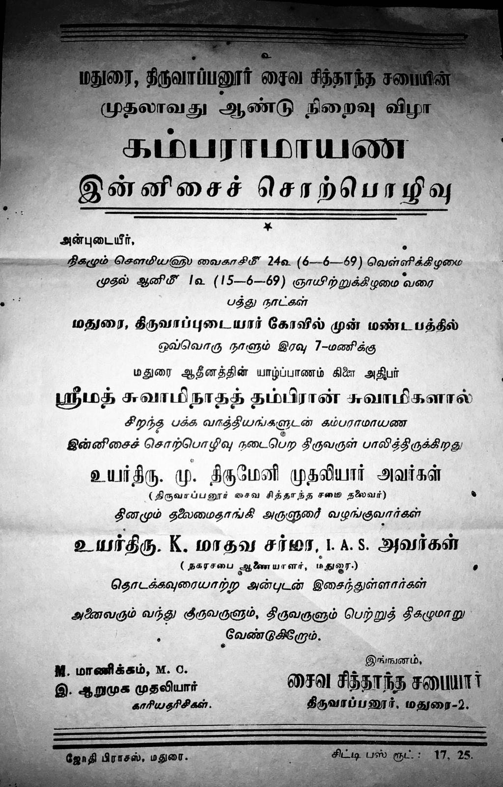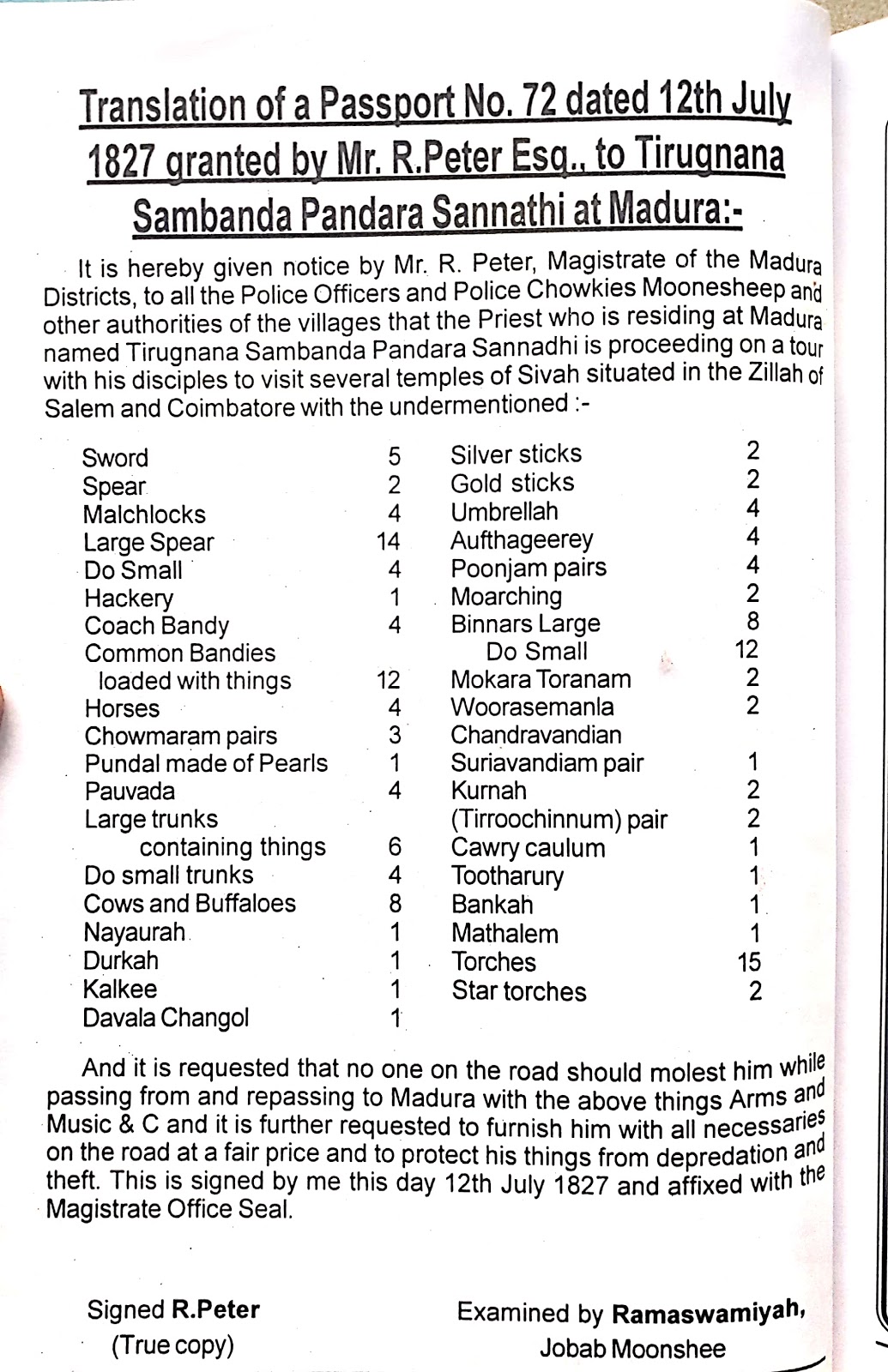 On 12 July 1827, when the Madurai Pontiff was going to travel with his devotees to visit the temples of Salem and Coimbatore districts of South India, the Madurai District Magistrate issued the following notice to all the Police officers and other authorities in the circuit of The Pontiff ordering the ultimate respect, care, comfort and safety to be accorded to him and the group of devotees. To the left is the issued order (Ref,: Book titled “Madurai Aadheenam Varalaaru” meaning “History of Madurai Aadheenam” published by the Aadheenam, Pg 42).