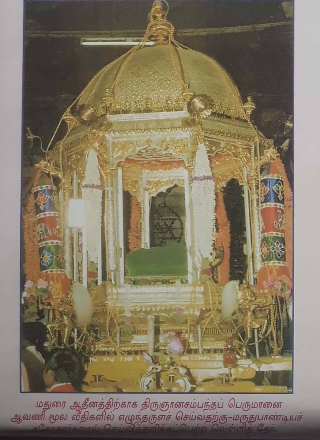 During this period, the Madurai Meenakshi Sundareshwarar temple flourished under the supervision and direct administration and mandate of the Madurai Aadheenam Pontiff. Vehicles and ornaments for the temple were created with overflowing bliss and joy and the Pontiff managed the entire administration.